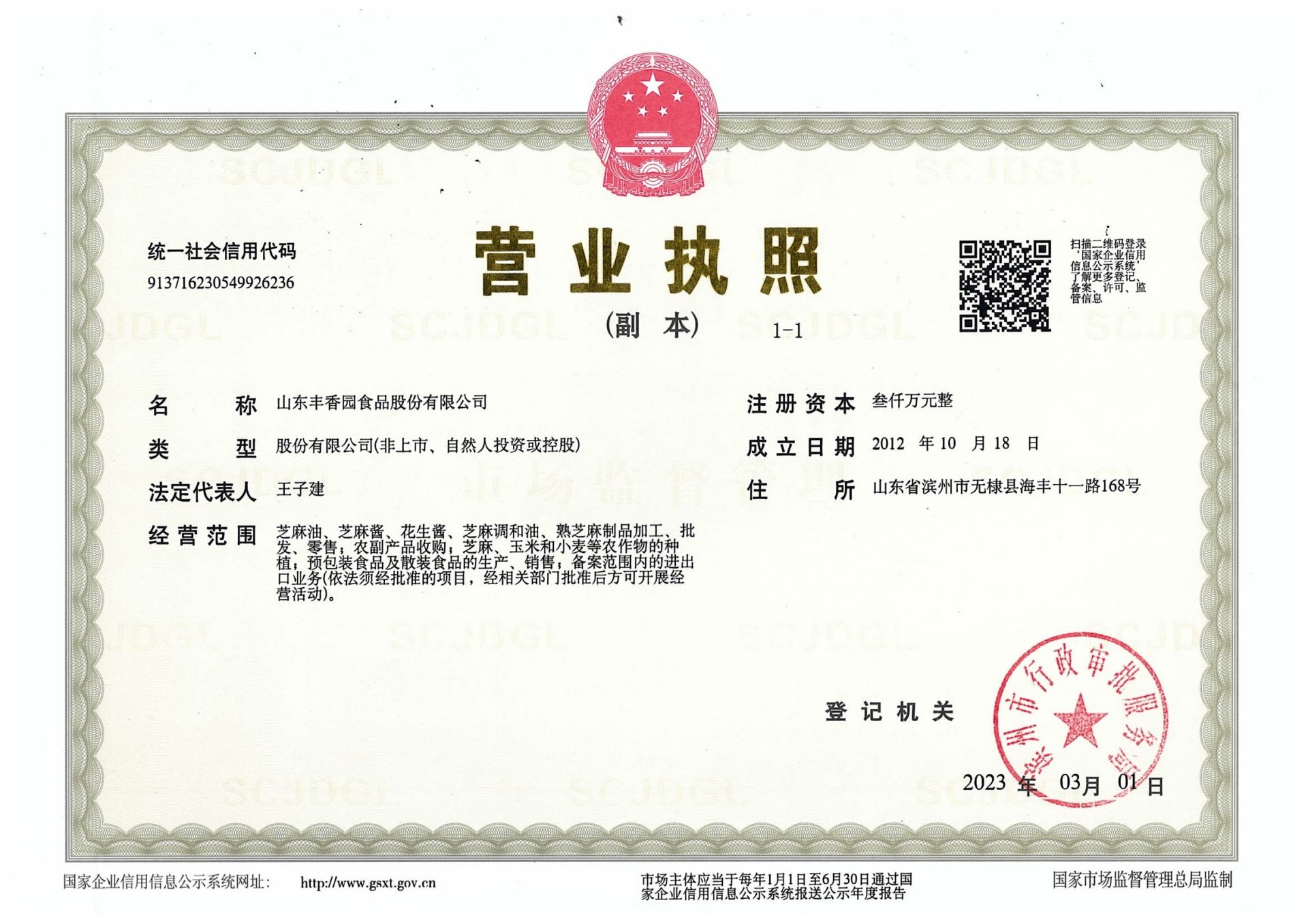 山東豐香園食品股份有限公司位于無棣縣西城工業(yè)園,成立于2012年,注冊資本3000萬元,員工60多人,年銷售收入8000多萬元,是“國家高新技術(shù)企業(yè)”、“中國好糧油”示范企業(yè)、“食安山東”示范生產(chǎn)加工企業(yè),公司集綠色、有機(jī)芝麻食品標(biāo)準(zhǔn)化、生產(chǎn)加工、研發(fā)、出口銷售為一體的山東省農(nóng)業(yè)產(chǎn)業(yè)化“重點(diǎn)龍頭企業(yè)”。        公司獲得HACCP國際質(zhì)量體系認(rèn)證、ISO9001:2015質(zhì)量管理體系認(rèn)證,產(chǎn)品獲得美國FDA認(rèn)證、美國、歐盟有機(jī)食品認(rèn)證、英國BRC體系認(rèn)證、A級綠色食品認(rèn)證、GB國標(biāo)有機(jī)食品認(rèn)證。        公司主要產(chǎn)品有芝麻油、芝麻醬、花生醬、芝麻粉和烘焙芝麻、兒童芝麻食品系列等六大種類上百個(gè)品種,產(chǎn)品出口美國、日本、韓國、新加坡、俄羅斯、澳大利亞、美國、等30多個(gè)國家。2018-2019年連續(xù)兩年芝麻食品出口量排名山東省第三位、濱州市第一位。        山東豐香園食品股份有限公司是國家級高新技術(shù)企業(yè),建有省級“一企一技術(shù)”研發(fā)中心、市級企業(yè)技術(shù)中心和市級工程實(shí)驗(yàn)室、市級工程技術(shù)中心等多個(gè)創(chuàng)新平臺,擁有發(fā)明專利2項(xiàng),實(shí)用新型專利21項(xiàng),先后獲得省級“專精特新”中小企業(yè)、市級農(nóng)業(yè)產(chǎn)業(yè)化聯(lián)合體、科技型中小企業(yè)、濱州市級瞪羚企業(yè)、市級“一企一技術(shù)”創(chuàng)新企業(yè)和濱州市新興產(chǎn)業(yè)“白名單”企業(yè)等榮譽(yù)稱號。